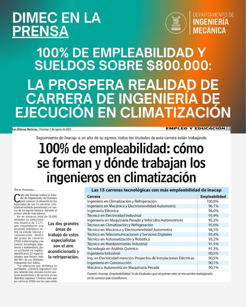 El diario Las Últimas Noticias destacó que la carrera de Ingeniería de Ejecución en Climatización, impartida por la Universidad de Santiago de Chile (USACH) a través del Departamento de Ingeniería Mecánica (DIMEC), ofrece a sus egresados un escenario laboral único en el país: empleabilidad del 100% y sueldos que superan los $800.000 desde el primer año de titulación.
