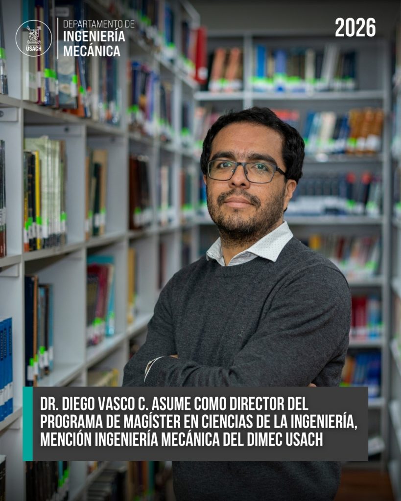 El Departamento de Ingeniería Mecánica (DIMEC) de la Universidad de Santiago de Chile informa a su comunidad que el Dr. Diego Vasco C. ha sido designado como nuevo Director del Programa de Magíster en Ciencias de la Ingeniería, mención Ingeniería Mecánica.
