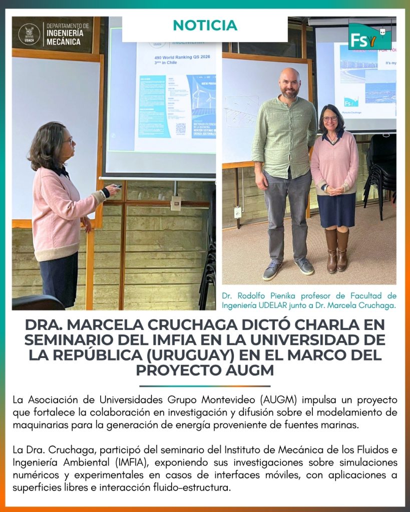 La Asociación de Universidades Grupo Montevideo (AUGM) impulsa un proyecto orientado a fortalecer la investigación y difusión de temas de interés común relacionados al modelamiento de maquinarias para la generación de energía proveniente de fuentes marinas. En este contexto, la Dra. Marcela Cruchaga, académica del Departamento de Ingeniería Mecánica de la Universidad de Santiago de Chile (DIMEC-USACH), dictó una charla presencial el lunes 27 de octubre de 2025 en el Salón de Posgrado del IMFIA, Facultad de Ingeniería de la Universidad de la República (Udelar), en Montevideo, Uruguay, con modalidad híbrida para público online.