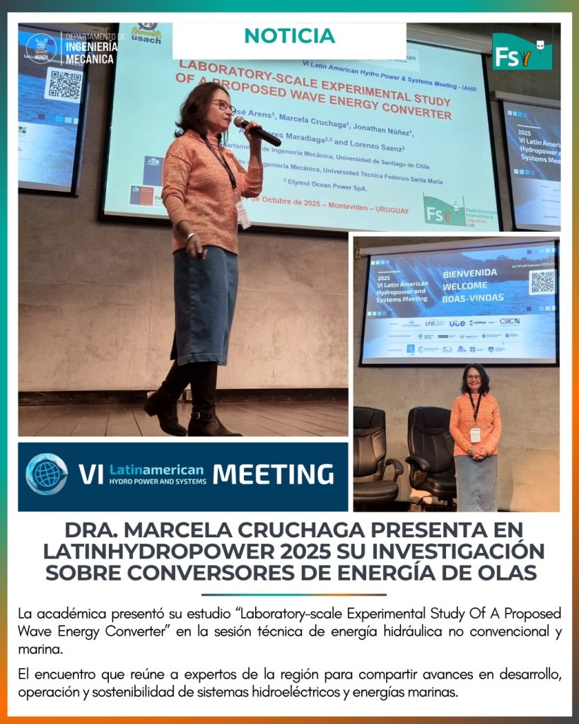 La Dra. Marcela Cruchaga, académica DIMEC-USACH, participó como expositora en el Congreso LatinHydroPower 2025, realizado en Montevideo, Uruguay, instancia que reunió a destacados investigadores, empresas e instituciones vinculadas al desarrollo de energías renovables e hidráulicas en Latinoamérica.