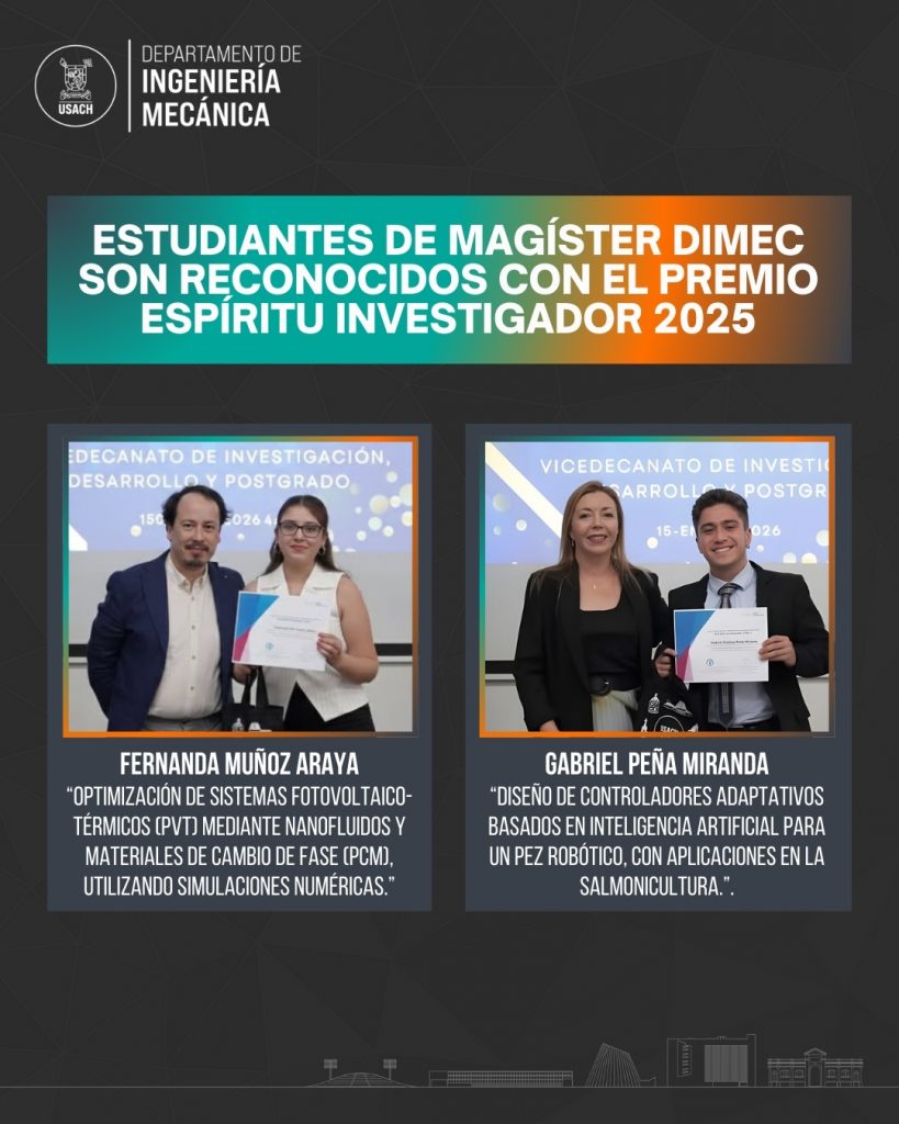 Dos estudiantes del Magíster del Departamento de Ingeniería Mecánica (DIMEC) de la Universidad de Santiago de Chile fueron reconocidos con el Premio Espíritu Investigador 2025 de la Facultad de Ingeniería, distinción que releva la excelencia académica y el aporte a la investigación desarrollada durante su formación de postgrado.