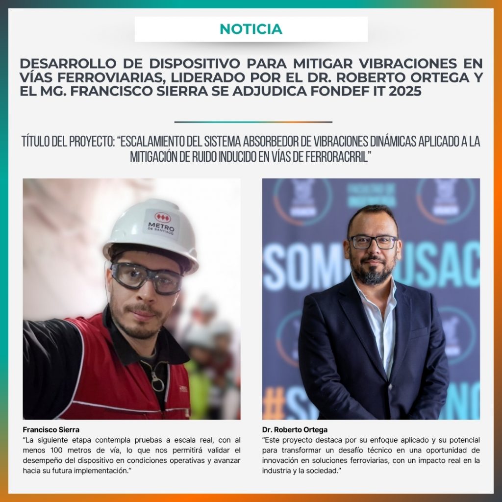 El Departamento de Ingeniería Mecánica de la Universidad de Santiago de Chile (DIMEC-USACH) celebra la adjudicación del Concurso de Investigación Tecnológica FONDEF 2025 de la Agencia Nacional de Investigación y Desarrollo (ANID), con el proyecto “Escalamiento del sistema absorbedor de vibraciones dinámicas aplicado a la mitigación de ruido inducido en vías de ferrocarril”.