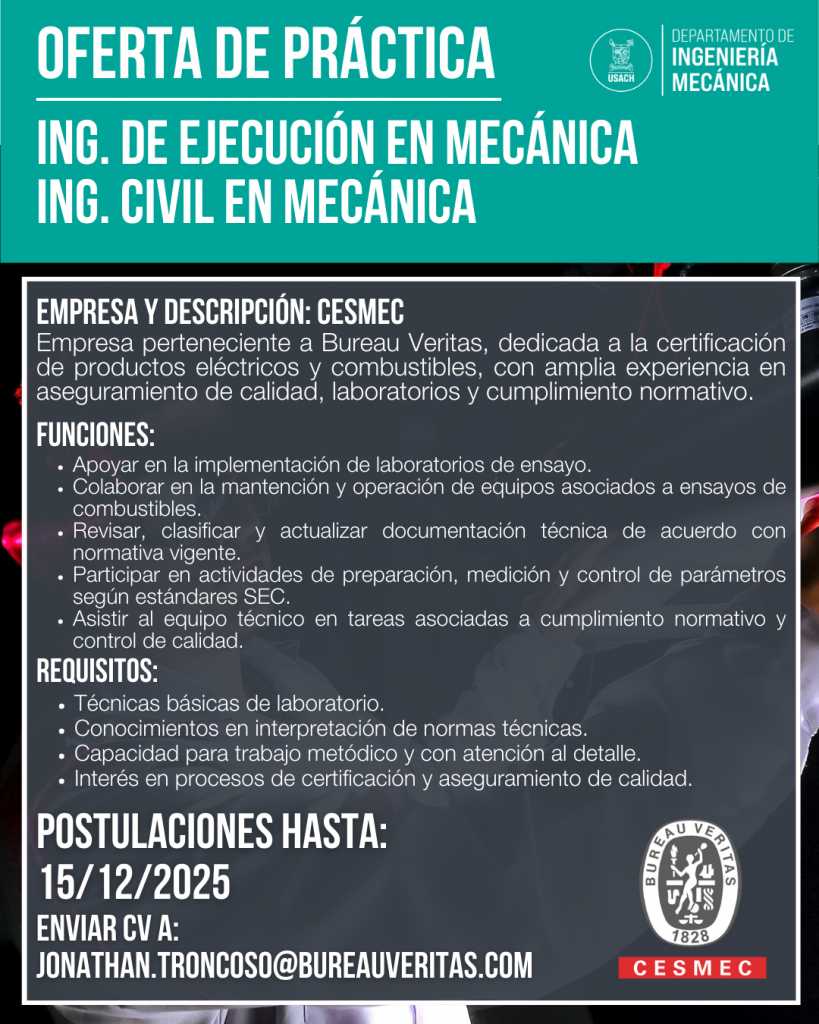 - Formación en Ingeniería Civil Mecánica o Ingeniería de Ejecución en Mecánica.