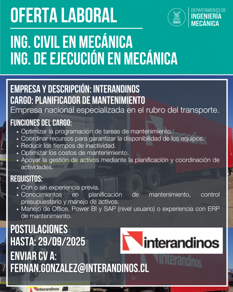 Enviar CV y antecedentes a: fernan.gonzalez@interandinos.cl
