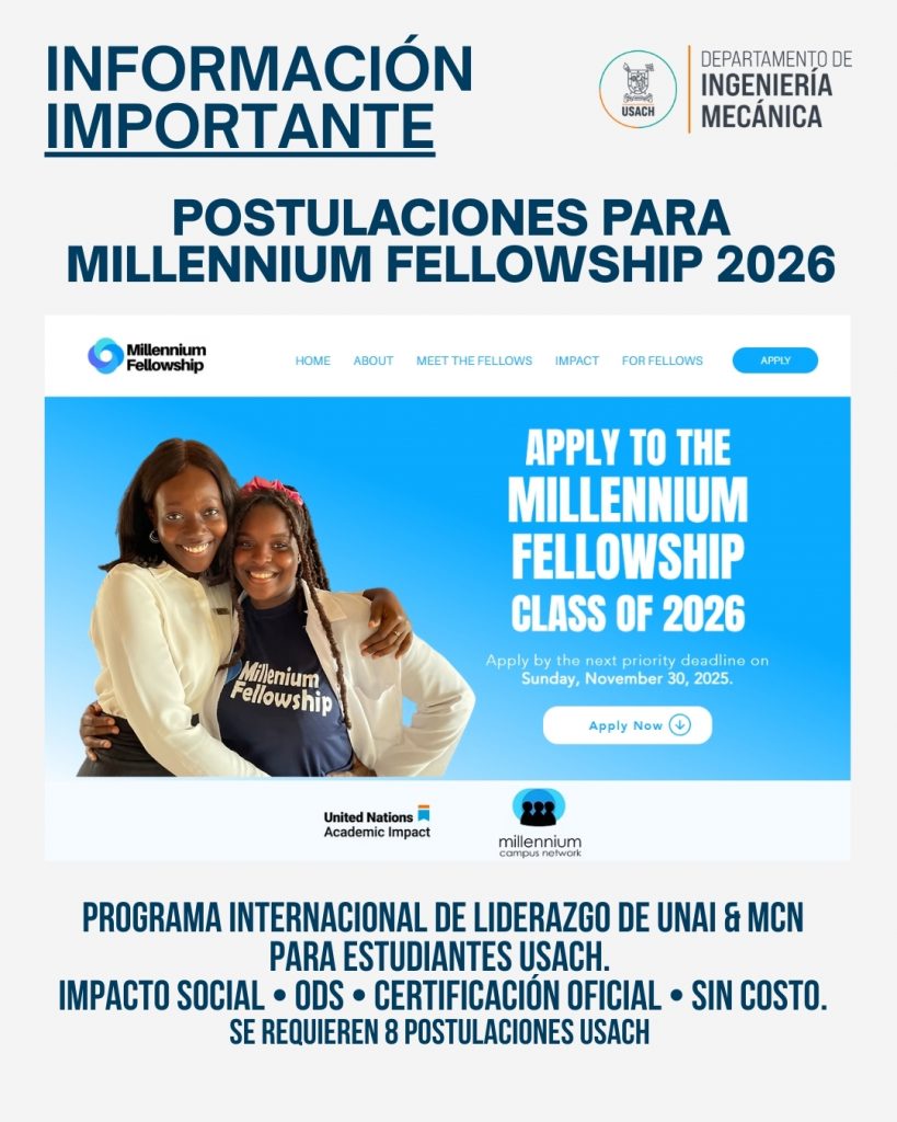 El Departamento de Ingeniería Mecánica (DIMEC) informa a su comunidad estudiantil sobre la apertura de postulaciones al Millennium Fellowship 2026, una destacada iniciativa de formación en liderazgo impulsada por United Nations Academic Impact (UNAI) y Millennium Campus Network (MCN), dirigida a estudiantes de pregrado comprometidos con el impacto social y el avance de los Objetivos de Desarrollo Sostenible (ODS).
