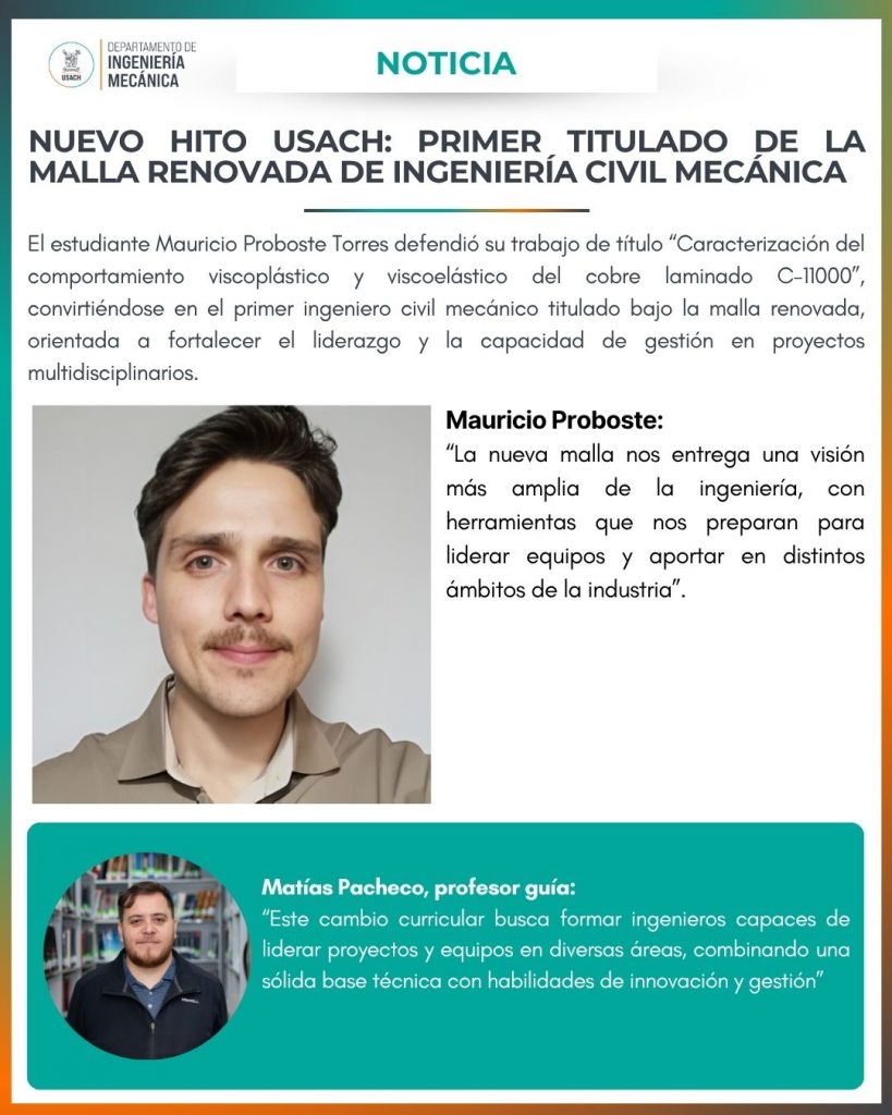 El viernes 17 de octubre, Mauricio Proboste Torres se convirtió en el primer egresado titulado de la nueva malla curricular de Ingeniería Civil Mecánica de la Universidad de Santiago de Chile, marcando un importante hito en la actualización académica del Departamento.