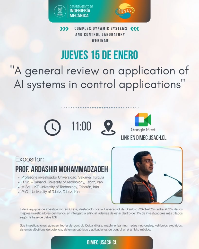 El Departamento de Ingeniería Mecánica de la Universidad de Santiago de Chile (DIMEC USACH), junto al Complex Dynamics and Control Laboratory (CDSC Lab), invita a la comunidad académica a participar en un webinar internacional que se realizará el miércoles 15 de enero, a las 11:00 horas, en modalidad online vía Google Meet.
